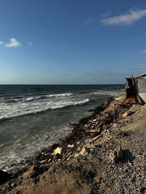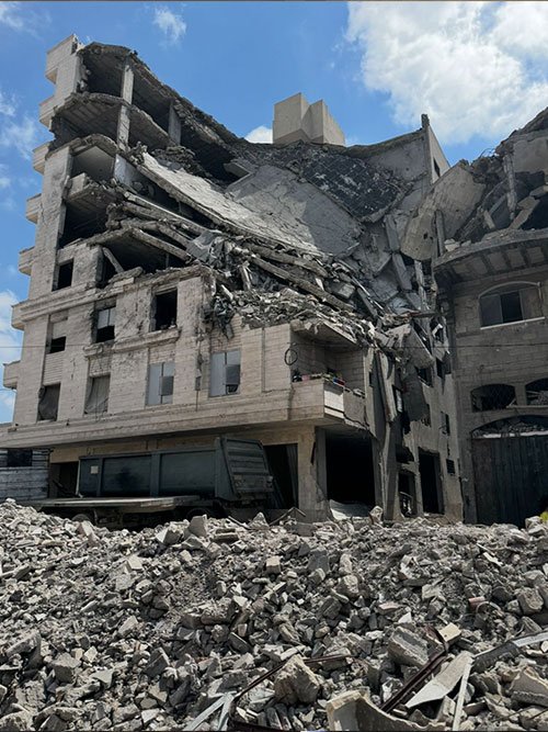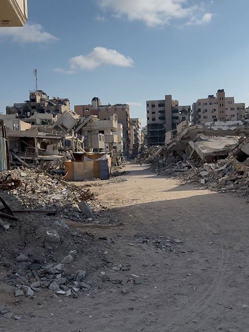 We went to the north per request of the WHO for extreme need. I landed at Shifa hospital in the part of Gaza known as Gaza city. Driving up that street (Rasheed St.) in the current context is like driving between heaven and hell. To the left, the beach and the serene ocean… waves lapping against the sand, the sun glistening off the water, absolutely majestic. To our right (east) is the absolute devastationscape… crumbled buildings, residual walls riddled with bullet holes, twisted metal half buried in the dirt… lives that once were. Entire apartment complexes leaning on one another like exhausted brothers… hollow, empty, and quiet. But if you pay attention carefully, you’ll see that the inhabitants of paradise reside on both sides of Rasheed. On one side the kids still splash at the water’s edge even though they’ve been told they cannot swim at risk of attack by the IDF warships. On the other side, within the rubble, between spaces made by rocket blasts, these same heavenly inhabitants have re-established homes upon/within the ruin… somehow. As you watch the videos, you may hear our guide explain what the buildings used to be… how some of those buildings were used as checkpoints by the IDF… and now what’s left… almost nothing.